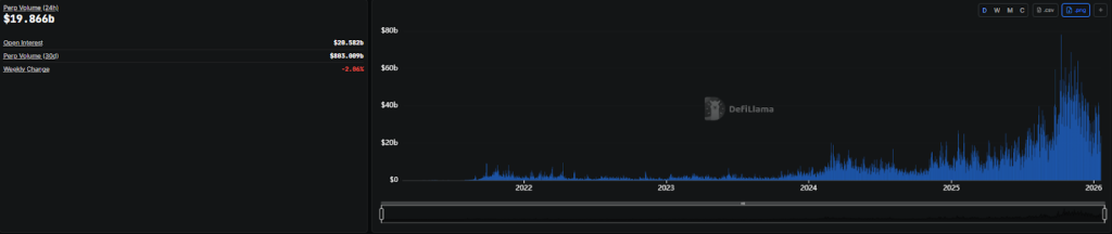 Segundo dados da DefiLlama, disponíveis em defillama.com/perps, o mercado de perpétuos segue aquecido. O setor somou mais de US$803 bilhões em volume nos últimos 30 dias e quase US$19,9 bilhões apenas nas últimas 24 horas. O open interest também subiu e alcançou cerca de US$20,6 bilhões.