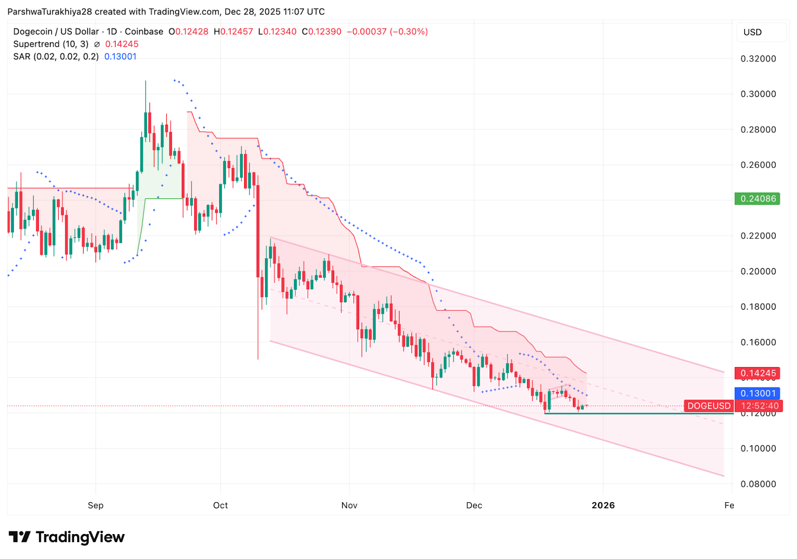 A Dogecoin continua negociada próxima de US$0,124, com o preço preso em um canal de baixa que se formou desde outubro. Esse movimento indica fraqueza prolongada, pois o mercado de cripto segue com apetite por risco reduzido. Além disso, a liquidez típica do fim de ano impede qualquer impulso consistente de recuperação.