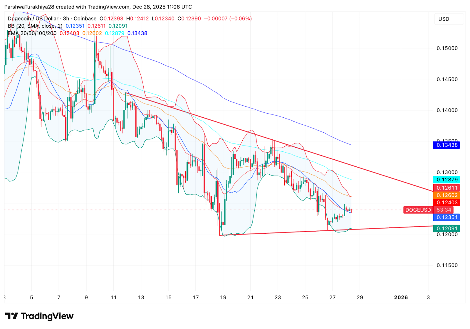No momento, DOGE se apoia na região inferior do canal, próxima de US$0,120. Esse nível segurou a pressão ao longo de dezembro. Contudo, repetidos testes sem reação aumentam o risco de uma quebra mais profunda.