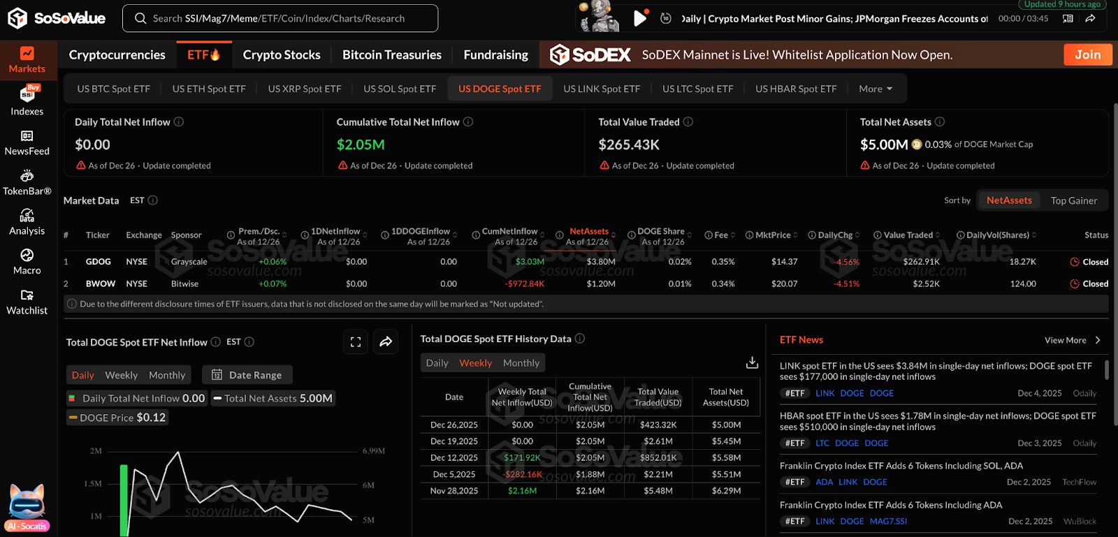 Os ETFs de Dogecoin ainda não exercem impacto relevante no mercado. Os produtos somam cerca de US$5 milhões em ativos totais, valor insignificante diante da capitalização de DOGE. Além disso, os fluxos diários seguem estáveis e sem entradas significativas.