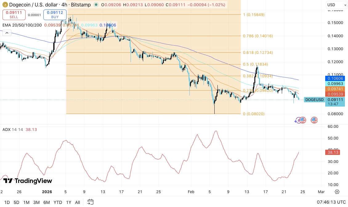 O Dogecoin mantém negociação perto de US$0,091 e segue dentro de um período de fragilidade no gráfico de quatro horas. O comportamento recente mostra perda de força compradora, além da dificuldade em recuperar níveis críticos. No entanto, alguns indicadores técnicos apontam possíveis mudanças caso as resistências sejam superadas.