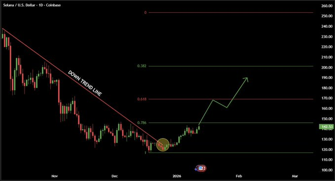 O analista NekoZ afirmou que a Solana rompeu uma linha de tendência de baixa que limitava ganhos desde novembro. Ele aponta que a formação de uma base arredondada na região de US$ 120, somada à estabilização no início de janeiro, abriu espaço para possível reversão.