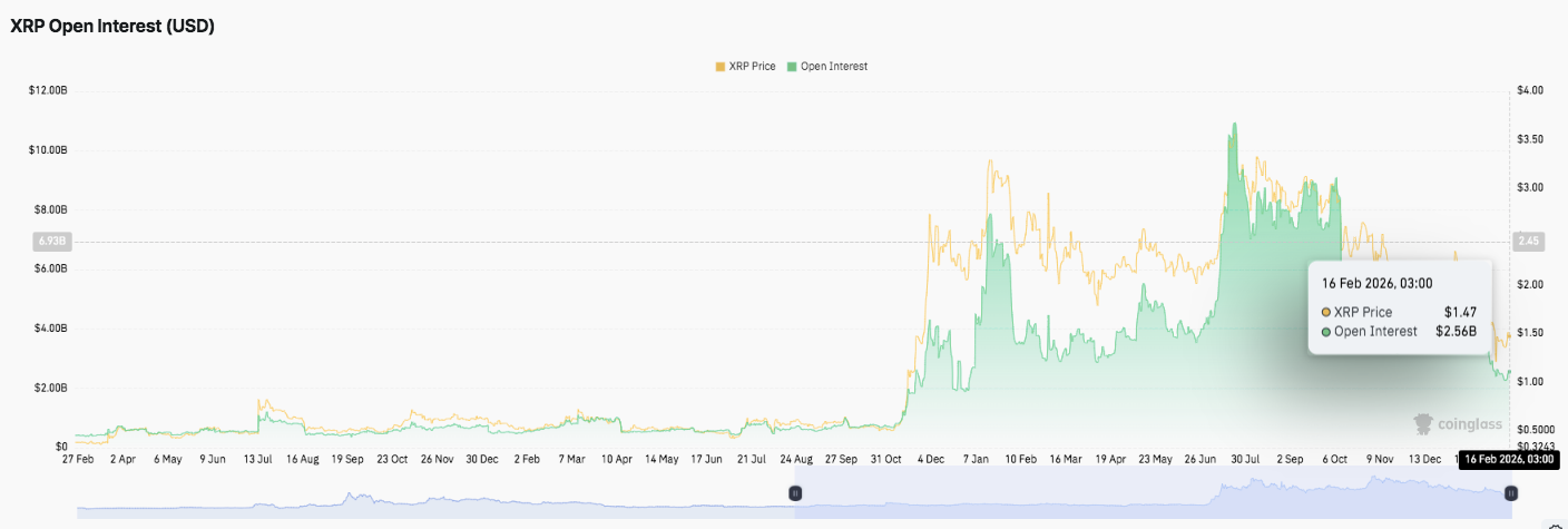 Os dados de open interest mostram que o ciclo de alavancagem completou um movimento intenso. As posições cresceram até o fim de outubro, ultrapassando US$ 10 bilhões. No entanto, desde então o open interest caiu para cerca de US$ 2,56 bilhões em meados de fevereiro de 2026, reflexo de liquidações e redução no apetite ao risco.